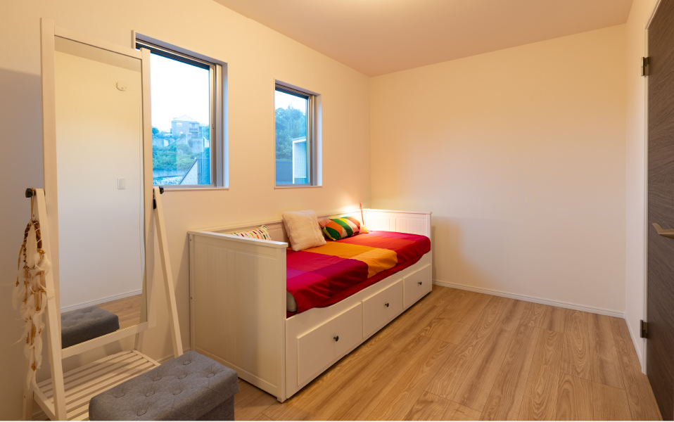 - 床・壁・屋根の6面で住まいを構成する2×4工法。地震や台風などの力を建物全体で受け止め、荷重をバランスよく全体に分散することで、抜群の強さを発揮します。