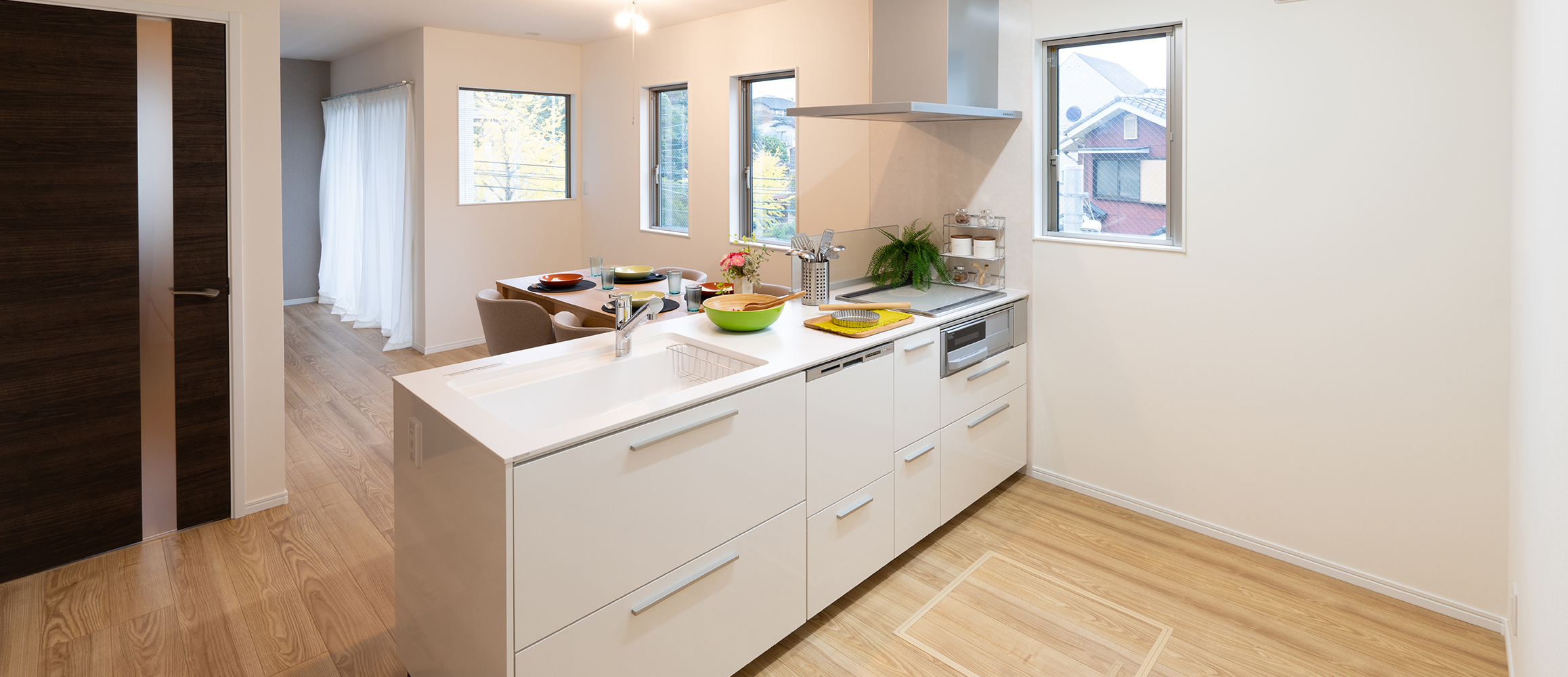 窓を多く設けたリビング・ダイニングは、自然光がたっぷりと差し込み、明るく開放感あふれる空間に仕上げました。機能性とデザイン性を兼ね備えたアイランドキッチンが、空間全体を美しく演出し、家族の日常からホームパーティまで幅広いシーンに対応します。1F・3Fへとスムーズにつながる動線設計により、移動も快適で暮らしやすさを実感。ゆとりのある空間の中で、心からくつろげるやすらぎの時間をお過ごしいただけます。