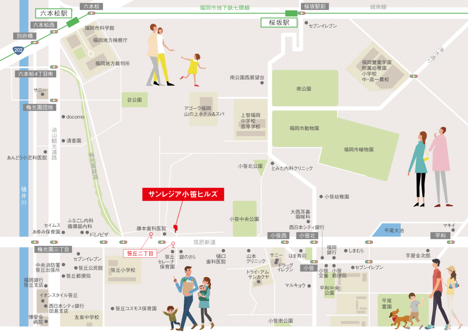 緑豊かな環境の下、福岡でも有数の教育環境が魅力の中央区小笹エリア。上智福岡を初め有名私立校が付近に集積した保育園や幼稚園も身近に揃う子育てにやさしいエリアで安心です。